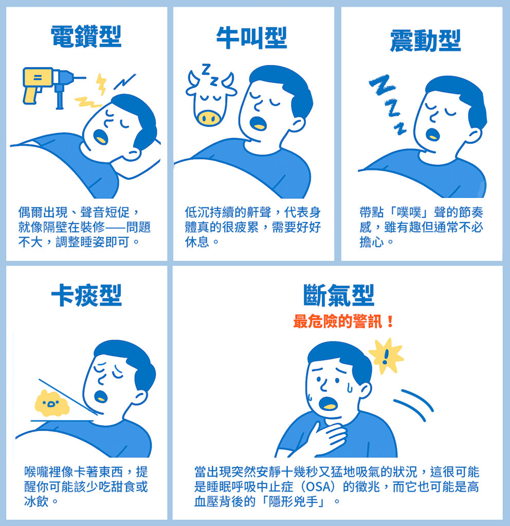 你是否曾被家人的打呼聲吵醒?其實,打呼是身體在睡眠時發出的「小訊號」,不同的聲音代表不同的健康狀況。以下幾種常見的「鼾聲類型」,幫你快速判斷: