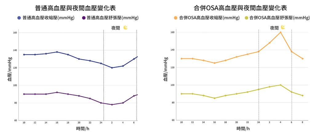 • 夜間血壓反而飆升:清晨3點到5點間,呼吸暫停造成血氧下降、交感神經亢進,使血壓可飆到160/100mmHg以上,甚至高於白天!